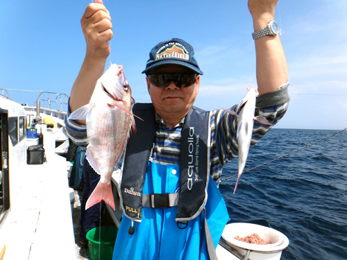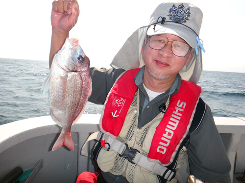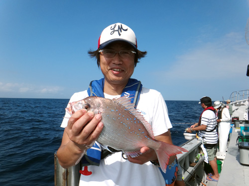 投入後、間を置かず左舷胴の間(中央)に座った藤安さんが良型のハナダイを釣り上げた。撮影していると、船長から「反対側で一荷(2尾)だよ」との声。駆け付けて写真に収めた。“モーニングサービス”は聞いた事あるけど“アフタヌーンサービス”もあったのだ。幸先の良さに気を良くしていると、左舷ミヨシ(船首)の岡田さんも竿を曲げた。しかし、船べりで無情にもハリから外れてしまった。大きかっただけに悔しそう。この後も頻繁にアタリが続いて、どうやら船長の心配は杞憂だったようだ。