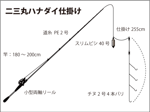 釣り人だけ入れ替わって「第1二三丸」は、午後0時20分に出港した。船長にハナダイの様子を聞くと「先週まではトップで30尾位だったけど、シケで潮が濁ったのと潮温が低下したから…行ってみないと」と、心配気なコメント。約40分で釣り場に到着。直ぐに投入合図が出た「タナは23mから16mまで探って。24mに漁礁があるから根掛かりに気をつけて下さい」。全員が期待を込めて仕掛けを投入した。