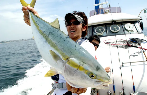 「キャストして、ジグがスライドし出す前に1度ジャークを入れてラインを張ると、次のスライドしかけた時にゴン!とヒットする」と伊東さんが、この日のパターンを説明する。トモ(船尾)で釣っていた潮田さんにもメジロがヒットして、ハマチ、ツバスもポツポツと釣れ続き、この日の釣りは終了。「家の前」での釣りだけに、帰港は滅茶苦茶早かった。