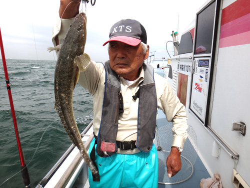 右舷側の鈴木さんが又、竿を曲げている。上がったのはヒラメ(ソゲ)。これは嬉しいゲストだ。大ドモの山本さんも、又又、竿を大きく曲げ、“大マゴチ”を取り込んだ。遠目からもデカイ!“モンスター”の一歩手前、目測55cmは有るだろう。そのままイケスに放り込んだ。