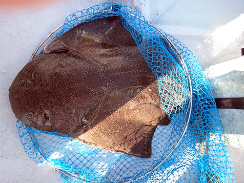 暫くして私の竿にアタリ。コクンコクンと竿先にシグナルが送られて来た。喰い込みを待って竿先を下げ“グーグー”で合わせると重い。確かな引き込みが伝わってくる。数回手巻きして電動リールのスイッチON。唸りを上げながらリーリング、時折竿先が海中に引き込まれる。中々上がってこない。「大物か」。期待と不安。あと7、8mの海中に見えたのは黒っぽい姿。サメか、エイか。タモで掬ってもらったのが余りお目に掛かったことはないカスザメ(図鑑で確認)だった。船長もリールを巻いていたが、「サメ、サメ」と言いながらリールを巻く。古屋さんも1m弱のサメ。船長、堪らず竿上げの合図。