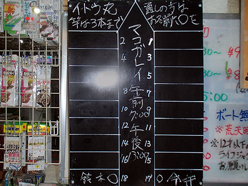 千葉県と言っても行徳は市川市、都心からは目と鼻の先。自宅の神奈川県・横須賀からも車で1時間30分。首都高・羽横線から湾岸道路を走り、千鳥町ICを出て江戸川放水路に架かる地下鉄・東西線鉄橋脇の『伊藤遊船』に午前6時15分に到着した。店主で女将の伊藤千鶴子さんとカレイ船担当の三島修船長が明るく迎えてくれた。店先の柱に、各々の対象魚毎に船座番号を書いた黒板が掛かっていて、先着順に釣り座に名前を書くシステム。テラスでは先着の釣り人が、お茶を飲みながら釣り談義をしていた。カレイ船は小学生の親子連れを含めて5人。午後船も出船していて、こちらは8人が予約しているとの事。午前7時、餌のアオイソメを受け取って出船。朝焼けの江戸川放水路を下る。