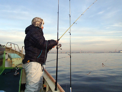 釣り人はトモ(船尾)とミヨシ(船主)の四隅に陣取った。私は空いていた左舷のミヨシに入り、右舷ミヨシには平野邦宏さん、天翔(たかと)くん(8歳)親子(立川市)、トモには今井雅之さん(江戸川区)、左舷トモには鈴木和夫さん(船橋市)が座った。各自3本ずつ竿を出す、私は取材もあるので1本竿にした。仕掛けは、船宿で買った“発光船カレイ”仕掛け、船長のお勧めだ。ハリのチモトに蛍光塗料の塗ってある10号のカレイバリ、モトスはナイロン3号、ハリス2号、片テンビンにオモリは25号をセット。アオイソメを4、5匹房掛けにしてチョイ投げして船縁へ立て掛ける。平野さん親子は6本を並べた。今井さんは2本をチョイ投げ、1本は真下に。ハゼの10束釣りで知られる“放水路の名人”鈴木さんが長竿を出していた。「カレイは久し振りで、マゴチ竿や軟調子のヒラメ竿を用意してきました」と言いながら、仕掛けを真下に落とした。
