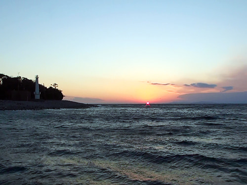 港を出ると南西の風がかなり強く吹いていた。ポイントの大瀬崎沖へは航程10分程。途中で「オモリは60号から、潮の具合を見て軽くしても良い」と船長からのアナウンス。最初のポイントは大瀬崎灯台のすぐ近く、岬の風裏となっていた。海底は海岸から急なカケ下がりで、驚くほど陸に近い場所でアンカーを投入。船長はアンカーロープを調整し、水深約35mの場所で船を安定させた。船長に聞くと、ヤリイカに交じってマルイカが釣れるポイントだそうだ。日没後の午後5時頃、海中に入れられた集魚灯と船上のライトが点灯された。船長から「タナは底から10mくらいまでをシャクりながら探るように!」とのアナウンス後、仕掛け投入の合図が出た。