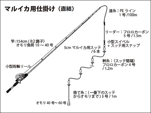 タックルは、マルイカ用ロッド(154cm、8:2調子)に手巻き両軸リール(PEライン1号)。仕掛けは、マルイカ用スッテ(5cm)6本の直結仕掛けと、プラヅノ(11cm)5本の直結仕掛け、2種類を用意した。先ずは、布巻きのマルイカ用スッテをセットした仕掛けから。オモリは最初60号を使用したが、潮が速くなかったのでタングステンの40号に換えた。小菅さんはプラヅノ5本の直結仕掛けからスタート。