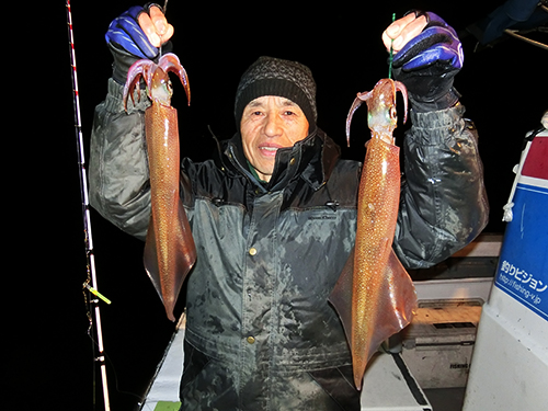 午後9時過ぎ、南西の風が西寄りの風に変わり、船の位置がポイントから外れてしまった。船長はマルイカのポイントに船を移動させた。仕掛けを入れると、すぐにマルイカが釣れた。マルイカの“触り”は頻繁で、シェイクによく反応したが、マルイカのサイズが小さいせいか、掛けるのが少し難しかった。小菅さんも仕掛けをプラヅノからマルイカ用スッテに交換、数杯のマルイカを取り込んでいた。約30分間で8杯、“入れ乗り”とまではいかないが、難しい“マルイカ釣り”が堪能出来た。午後10時、頻繁なアタリに後ろ髪を引かれながら沖上りの時間となった。マルイカと良型ヤリイカ、ボリュームのある釣果