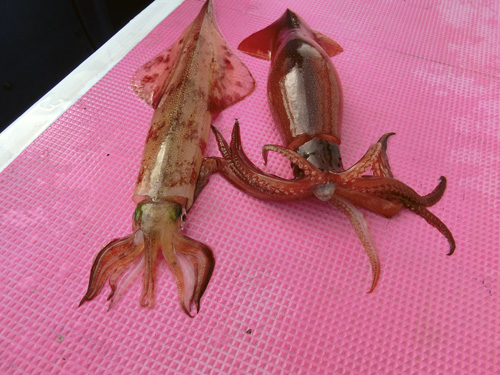 船は少しずつ灘寄りの少し浅場(水深140~160m)へと移動。午前7時半頃、「乗ったよ」と小菅さん。撮影に向うと、最初のヤリイカはカメラの前でポチャッと海面に落ちた。仕掛けを手繰っている途中、手が滑ったようだ。「折角の最初のイカを…」と、小菅さんを虐めた。暫くして、永井さんがでっぷりとした大型のスルメイカを取り込むと、スルメイカに交じってヤリイカがポツリポツリと釣れ始めた。