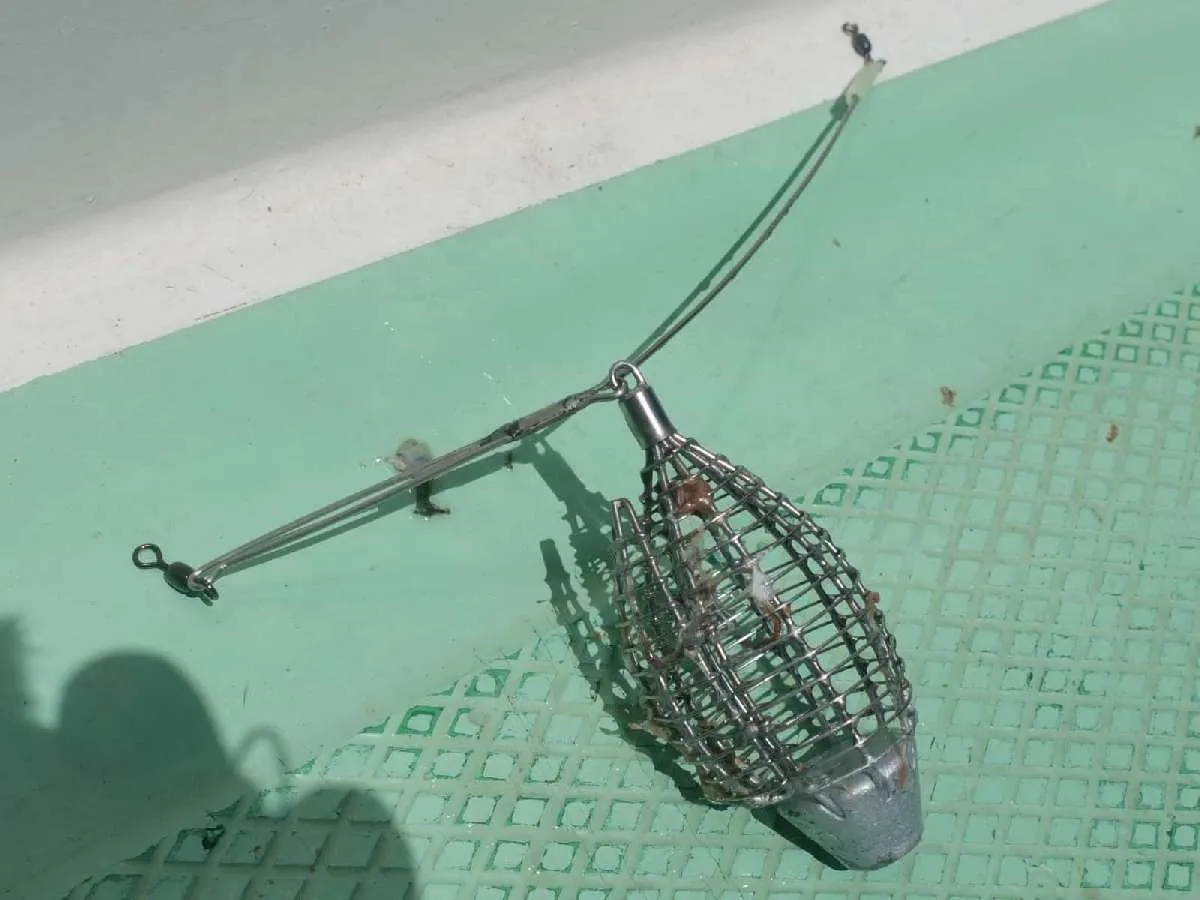 今回は『振り分け仕掛け』を試してみた。エダスではなく80cmと150cmの1本ずつのハリスをそれぞれヨリモドシに結ぶ。ハリス絡みを心配したが思ったよりも絡みは少なく、魚のハリ外し、餌付けをハリ1本ずつ行い、餌付けした方のハリは船外へ出しておけるので、これはこれで手返しが良い。