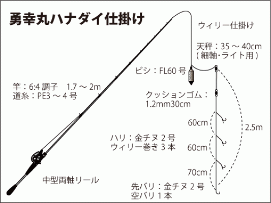 右舷ミヨシの林伸さん(墨田区)がリールを巻き出した。海面を割って姿を現したのは、待望のハナダイ。船中第1号だ。「やったね」と、自然に言葉が出てしまう。元気よく暴れている。暫くして、また、林さんが重そうにリールを巻いている。ドラグが滑り中々上がって来ない。取り込んだのはウマヅラ。それもデカイ。五目釣りになって来た。私も竿を出した。クンクンと竿先が揺れた。バシッと合わせてリーリング。残念ながら“本命”では無かったが良型のウマヅラ。このサイズなら我が家では1匹で2人前のおかずになる。ベタ底を狙っていたらベラが来た。次は、海底でコマセをポロッと巻き、2m程上げて竿掛けに掛ける横着な釣りと決め込んだ。直ぐにククッと小さなアタリ。竿を立てると、グン、グンと竿先を引き込む。“本命”か?ドラグ調整していない事に気付いたが後の祭り。キュン、キュンと断続的に船底に引き込まれる。竿を立て、強い引きには竿のやり取りでかわし、海面に現れたのは船中第2号のハナダイ。30cm級を手にした。5分過ぎ、隣の関谷広吉さん(九十九里町)が小振りながらマダイを上げた。船は一気に活気付いたが、その後、竿を大きく曲げるのはウマヅラだけだった。潮温が低くても、潮の動き次第で食い出す船長は「2月に入り、急に海水温が下がり、13度台まで低くなってきました。15、16度になるとハナダイはウィリーを追って来ますが、それ以下だと空バリ仕掛けに沖アミの餌を付けた方が良い様です。片貝の仲間の船が4日(水)30mダチで、25~38cmを13~43匹。別の船は40mダチで、10~21匹釣っています。ウマヅラやホウボウが釣れる時は、魚もやる気がある証拠。潮温が低くても、潮の動き次第で一斉に喰い出します。ポイントには20年もコマセを撒いているので、ハナダイは確実に付いていますよ」と話す。片貝沖のコマセシャクリは、型が良いので釣り応えも充分。シャクリのスピードや止めの時間、更に食いダナを探すテクニックで釣果に差が出る。これから本格的な春に向って、活性が上がって来れば、益々面白くなるだろう。