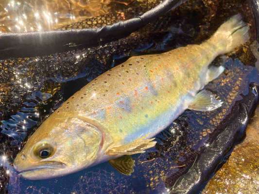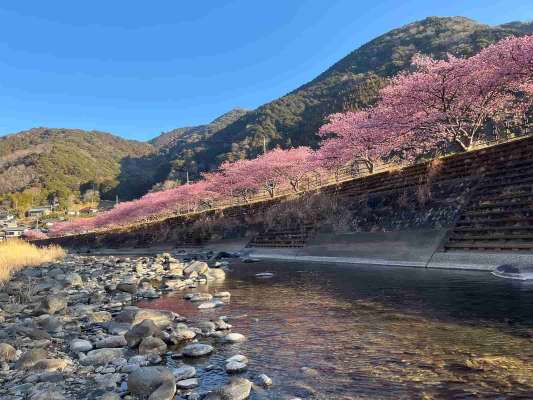 Uターンした私は、RYUKIグリーンカラーのミノーに変え気分も一新、釣り開始!すると、今までが嘘のように3匹の魚が強烈なチェイス合戦!何だこりゃ~!再びキャストすると、またしても複数の追尾が!しかも良型ばかり!突然の活性の高さに驚くばかり!あのまま場所移動をしていたら、この「時合い」を完全に逃すところであったと恐怖に震えた(笑。この「時合い」は皆で楽しみたい!ということで友人も召集~!腕の良い友人は、到着数分で複雑な流れを攻め良型アマゴをGET!立て続けに2匹目も!さすがだ!この頃あちらこちらでチェイス爆発!こんなにどこにいたの??バレも多発するがこりゃ~楽しい!しかし、スプーンを使っていた相方は反応が薄い、顔が暗い・・・(笑。どうやらミノーに反応が良いようだ!しかもグリーン系のミノーに抜群の反応を見せていた。春一番乗りの私はここぞとばかりに「グリーンのミノーが良いよ!」とアドバイスしてみた!フフフ・・・。こうなったら全員グリーンカラーのミノーである(笑。浅場が多く、根掛かりも多いので、この日はシンキングでもゆっくり沈むタイプでアクションを大きくし、できるだけ早いアクションをさせると効果的だった。ミノーを通していない場所を攻めれば一発!もの凄い勢いでかっ飛んでくる。バラしても少しポイントを休ませれば再びチェイスが始まった。川は貸切、誰かがアマゴを手にするたび歓喜の声が飛び交った。しかし山の陽暮れは早く、14時30分を過ぎると、川には冷たい風が吹き始め、山陰になる場所では陽が当たらなくなってきた。呼応するように魚の活性も静まり返っていく。しかし、それまで実に4時間に渡り、たっぷりと楽しむことができた! 春本番の暖かさとなった2025年の解禁日!見上げれば抜けるような青空、河岸には鮮やかなピンク色に染まった満開の河津桜、そして川には朱点が美しい女王アマゴ。もちろん全員安打!みな美しい春を手にすることができ、体いっぱいに春を感じる素晴らしい解禁日となった。いよいよ始まった渓流シーズン、春めく河津川はあなたに素敵な春時間をもたらしてくれることだろう。