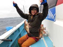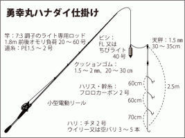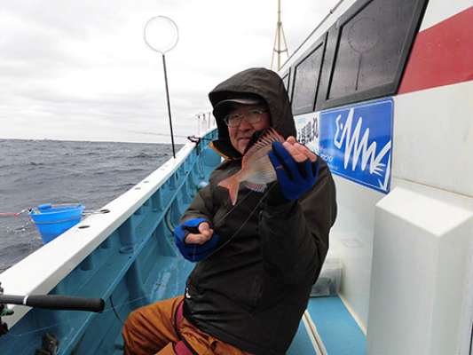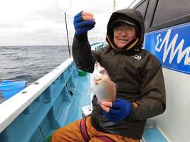 沖上がりの時間が残り1時間を切った頃、私も竿を出した。1投目からウマヅラハギが顔を出し、2投目にはハナダイが上がった。今回はライトタックルだったので、30cmを超えるハナダイが掛かった時などは、ロッドが絞り込まれ、釣趣満点である。それにしてもこのウイリーシャクリという釣りは奥が深い。魚の活性が高い時にはそれなりに釣れるものなのだが、そうでない時にはハリやハリスの号数は勿論、ウイリーの配色、シャクリの誘い方一つで釣果に顕著に差が出る。その「アタリ=ヒットパターン」を見つける事に面白味を感じる方も多いだろう。勿論、私もその一人である。今後も片貝沖は様々な魚種に期待大!「今日は前半厳しい状況でしたが、後半狙った沖のポイントにまで行ければ結果を出せると思っていました。短時間でしたけど、皆さん“お土産”になってホッとしています。今後も海況が落ち着けばハナダイはまだまだ有望ですよ」と船長。まだ当分は期待してもよさそうだ。