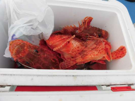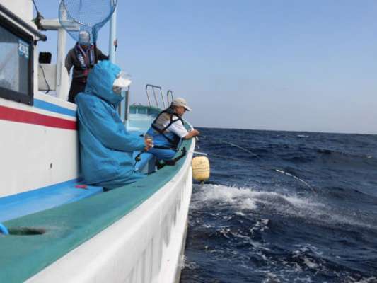 皆さんその後もサバに悩まされる。私は終始竿を手持ち、小まめにタナを取り直しながらサバを避け、オモリで底を叩いたのが功を奏したのか“ゴンゴン”のアタリが続き、放流サイズ(300g級)を含め7尾をゲットした。この日はオモリが海底に着いたのを確認して誘い上げていると、潮が速くオモリが浮き上がってしまう潮況。こうした時には、面倒でも直ぐに巻き上げて仕掛けの入れ直しをしてタナを取ることが重要。北山茂樹船長も「タナ取りがキモ」と言う。また、支給された餌のサバの短冊は身の部分が多く付いているので、2mm位にまで削ぎ落としてヒラヒラさせた方が食いはいい。これからは、型も数も狙えるシーズンになる。