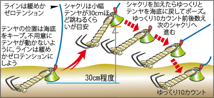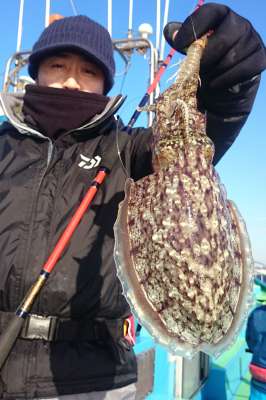 一之瀬丸・神奈川県金沢八景 2016.12.8号 今季は好調! 東京湾の風物詩スミイカが大型化 東京湾で冬の風物詩の一つとして長い歴史を持つ甲イカの一種スミイカ。大量の墨を撒き散らすのでその名が付いたが、ねっとりとした甘みは江戸前寿司のネタとして江戸時代から有名だ。伝統の羽子板テンヤで釣るため、そう数は伸びないが、今季は秋の開幕から絶好調。そこで今季、竿頭が30杯を記録した金沢八景『一之瀬丸』のスミイカ担当、渡辺直人船長に、独特のテンヤ釣法をレクチャーしてもらった。 好調の証し! 今季はサイズもポイントも満遍なく散らばっている やったね、500g級にVサイン! 「今、どこで釣れているかと問われれば、東京湾全体ですとしか言いようがないですネ。それほど各ポイント万遍なく釣れています。僕は結構、先取りして狙っていくんで、今は竹岡沖から下浦沖の深場。その分、400~500gと良型がレギュラークラスです」とは渡辺船長。テンヤの釣りはしゃくった時にガツンと衝撃がくる独特の釣趣だが、それも500g級になってくると、ひと際強く、竿が折れるかと思うほどだ。その快感が忘れられず、どんどんハマっていくマニアが多い。一方で、地道に底層を探るため数が伸びず、ツが抜ければ(10杯以上)上出来、ビギナーはオデコの可能性も……という釣りなのだ。 テンヤにしっかり抱き付いた良型 つまり、1杯でも釣れればその魅力が分かるわけだが、今期は秋口の開幕から絶好調。『一之瀬丸』では開幕からオデコを回避できた日が多く、ガツンッを味わえる可能性は高いから、入門の大チャンスといえよう。「今期は海水温の下がりが遅く、初期に狙う水深12~13mといった浅場にもわんさかいるし、今頃から徐々に落ちていくんで、もちろん深場にもいる。 スッテにも良型が乗ってくる! 面白いのは、現在の最大級になる750~800g級は意外と浅いポイントにいるんですよね~。深場は確かに良型が揃っていますが、特大はなぜか浅い。まあ、浅い方が釣りやすいから、ビギナーにチャンスです」と太鼓判だ。 ヒット時の衝撃を受け止めるには専用タックルが必要 スミイカはテンヤの構造上、竿をシャクッって主に口以外に掛ける、いわゆる引っ掛け釣り。この衝撃は小型(150g前後=タワシくらい)でもそれなりに強く、ゆえに超先調子で胴がガッチリ硬い竿が必要になる。流用できる竿はないので、昔から専用竿があるから、それを購入すべし。セットする小型両軸リールも頑丈さを第一に選ぶが、こちらは近年、削り出しのボディなど頑丈な高級品が出回っていて、これがベストになる。 伝統のスミイカテンヤ(左)と餌木などスッテ系 大昔は糸からそのままシャコ付きテンヤだけを装着していたが、30年近く前からスッテが登場し、テンヤの少し上に装着するのが流行り出した。現在の餌木スミイカの原型とも言えるが、こちらもテンヤをしゃくれば踊るので、乗る確率も高く、多くの人が付けている。 スミイカは寿司ネタにもなるシャコが大好物 「どっちがいいですか、と問われれば、付けた方がいいですと答えます。ベテランにはシャクリの感覚が違ってくるという人もいますが、底ベタのテンヤではなく泳層で漂うので、ヤリイカなどのアピールヅノと同様、スミイカを寄せる効果があると言えます。数を狙うなら、お薦めです」と船長は言う。 シャコをテンヤに装着したところ なお、餌のシャコは生きたものを使う。東京湾はもともとシャコの宝庫で、ゆえにスミイカが主食の一つとしていたもの。だから色艶や目の蛍光色の輝きを考えると、生きたものがいい。昔は付近の漁師さんがわんさと獲って、それを安く購入していたが、過去に大不漁となった年以降は不漁が続き値段が高くなった。そのため乗船料で付くのは5匹で、6匹目からは有料。テンヤにシャコを付けるにはちょっとしたコツがいるので、ビギナーは最初の1匹目は船長に教えてもらうといい。ちなみに装着する時、よく切れるハサミと輪ゴムは必需品なので持参しよう。スッテ選びはあまり難しくなく、6~7cmサイズのウキスッテか、2号前後の餌木でもOKだ。 釣り方のカギはいかにシャコを本物に見せるか 餌のシャコは自然界では海底を這いまわり、時にエビのようにパシンと尾を振って飛び上がり、また海底へ軟着陸する。それをスミイカが見つけて、上からバッと覆いかぶさるように抱き着く。 そのため、シャコの付いたテンヤも同様に動かして、本物のシャコのように見せる必要がある。経験が豊富なベテランは竿の操作でその演出を上手くやるが、ビギナーにはなかなか難しい操作の一つといえよう。 スミイカはこの格好で泳いでいる 基本はリールを包み込むように持ち、他方の手はその40~50cm上。胸元で肩幅くらいの幅で、リールを下にして斜めに持つ。そして、上の手を少し前に。これでシャクリの最初のポーズ。ここからリールを支点に上の手を手前に引き寄せてテンヤをシャクリ上げ、そのまま上の手を前へ下げていっ