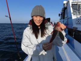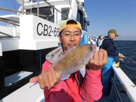 陽も傾き始めた午後4時過ぎ。ここでついに来た。左舷の篠塚秀一さんの竿が激しく叩かれる。今度こそ良型マダイか?ジジジーというドラグ音が心地よい。上がったマダイはこの日最大の1.4kg。前日は3kgオーバーも交じる好調ぶりだったがこの日はこれにて終了。あまりに小ダイが元気で狙いの“大ダイ”は姿を見せなかったが、それでも1kg前後のナイスサイズは数上がった。カンパチ(ショゴ)、ホウボウ、キントキなどの高級“外道”も交じってお土産は十分。魚探に映し出される反応を見ると今後も数釣りの期待は大きい。ロングランで秋マダイの数釣りが楽しめそうだ。