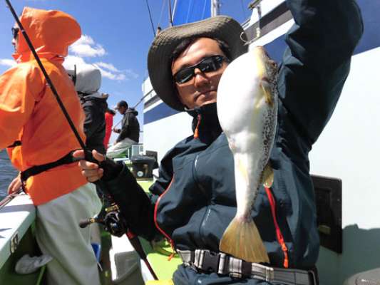 「来ましたよ!」。まさかの連続ヒット。小気味良い湾フグの引き。産卵を控えた良型が今までの沈黙が嘘だったかのように掛かる。圧巻は左舷トモ(船尾)の松田正樹さん。怒涛の6連荘で、それまで船中で“ツ抜け”がやっとと言う状況下でまさかのトップ10匹を達成。船中でもこの流しで20匹近くが上がった。それでも今シーズン最低と言う不名誉な記録を達成した取材となってしまったが、終わり良ければ全て良し!確かな手ごたえを感じることが出来たし、最後までだれ一人諦めることなく釣りを続けた事へのご褒美なのかもしれない。「白子祭り」のうちに是非1回初の「湾フグ」を楽しみにしていたが、自分では竿を出すことが出来なかった。しかし、近くで見ていて、「湾フグ」の奥深いテクニカルな釣法は十分に分かった。嵌る人が多いのも頷ける。何より健太郎船長自らがその虜になっているのも分かった。次回こそは実際にやってみたい。絶品の白子を楽しめるうちに是非とも再訪だ。