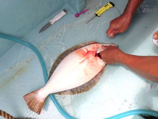 朝の内チャプチャプしていた海も段々と凪いで来た。しかし、これに反するように船酔い者が数を増す。続々と船室に入ってしまい、外で竿を出す人数は3人に。ヒラメと言う魚、誰かが1匹掛けると触発されて他の魚も餌を食うことが多い。しかし現時点で下に泳いでいるイワシは3匹。周りの船では景気よく釣れている話も入ってきているので間違いなく下にヒラメはいるのだが、中々厳しい状況が続く。船長も1人でも多く竿を出してほしい気持ちがあるのだが、船酔いでは仕方ない。10月1日に完全“解禁”。ロングランで楽しもう魚影は濃い。頑張って船酔いにもめげずに竿を出し続けた人にはアタリが来る。野村和裕さんには2連発でヒラメが来た。最初のアタリこそ疑心暗鬼だったが、2匹目はアタリを確信して獲った。結局、最後まで竿を出し続けた人は全員“本命”の顔を見る事が出来た。これから迎える10月1日の完全“解禁”。船長の話では、ポイントはまだまだあるそうだ。大原沖のヒラメ釣りシーズンがいよいよ開幕した。