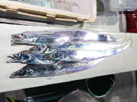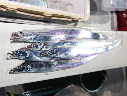 船中良いペースでタチウオが上がったので、ここで私も竿を出した。まずは水中ライトを装着しないでスタートする事にした。一旦45mまで沈めて佐野さんのパターンで狙ってみる。2m細かく誘って食わせる間を取る。これを35mまで誘うと、「コココッ」と竿先にアタリが出た。一旦アタリを見送り、微妙に穂先だけの感覚で誘いを入れてみる。この時、更にアタリが大きくなり合わせるとヒット。1投目からタチウオの引きを味わい90cm級のタチウオを上げる事が出来た。更に3投で3匹連続ヒット。見ていると水中ライトを装着しなくても大丈夫と思うかもしれない。ところが、確実に違う部分を見つけた。「アタリ自体はライト付きより少なく、誘い込むタナが長い距離になる」という事だ。次に、確りと蓄光させたオモリを使うとタナは短くなり、アタリが少し多くなった。そこで、ハリ付近に装着する夜光タコベイトを付けてみると、確実にアタリ多くなり、さらに食い込みを待てる状態に変化。ヒット率もアップした。何も装着しない時は追い食いが少なく1回のアタリを仕留める事に集中したが、装着後は「アタリが有ったらどう食わせるか?」と攻略の余裕が出来る感じだ。ただし、潮の影響や活性の状態で変わって来るので、ハリのサイズを変更等、他の部分のアイテムも釣果アップの幅を広げる事が出来るだろう。後半アタリが少なくなり単発のヒットになったが、上がり間際に再び活性アップ。そのまま午前0時、沖上がりの時間を迎えた。トップは佐野さん、1m越えを含む32匹、三浦さんは、友人に釣りを教えながら25匹とまずまずの釣果。「やっぱりタチウオは楽しい」と実感した釣行だった。シーズン後半との事であるが、まだまだ行けそうな夜タチウオ。是非楽しんで見ては如何だろうか。