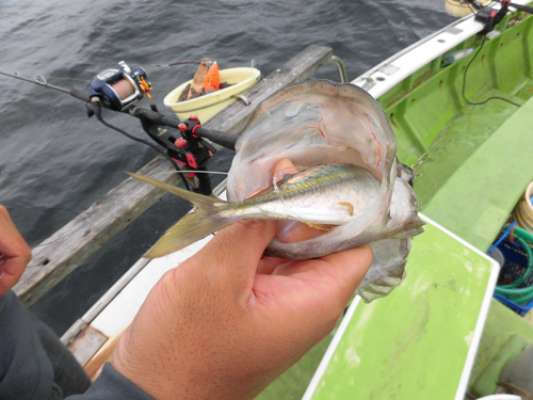 移動先の城ヶ島沖は、水深が90m程と深め。潮は相変わらず速めなので、ここでの泳がせは断念。全員がアジを一生懸命狙う。コマセが効き出すと全員が入れ食いモード突入。ビシカゴ着底後にすぐさま糸フケを取ってコマセワークスタート。海底5mの位置で待っていると5秒と間を空けずにアジが竿先を叩く。しかも2点掛けが頻繁だ。仕掛けがタナにあれば空振りなしで釣れていく。いよいよアジの食いが本格化したようだ。ラストはワラサフィーバー正午を過ぎると大型クーラーがアジで埋まった。十分以上にお土産を確保して最後はまた朝一の“端物”ポイントで30分一本勝負。この30分は圧巻だった。立て続けにワラサが食う。泳がせで竿を出していたのは4人。まず私に4.5kgオーバー。そして小林さんはこの日2匹目、何と最大の6.3kgのブリ級。最後は佐藤さん。初の“青物”と言う事で喜びもひとしお。“本命”アジも小林夫妻は共に50匹越え。“裏本命”のワラサも船中4匹と皆満面の笑みでの帰港となった。