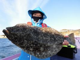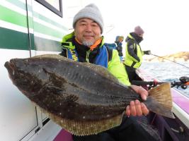 結果、0.6~4.8kgのヒラメ1~6匹。竿頭は小松さん。次頭5匹2人、4匹2人と続き、船中14人で41匹の好成績。ハリス切れなどのバラシも数回あった。釣れるのは身が厚い美味しそうな“寒ビラメ”ばかり。「これからも大物、大釣りのチャンスは続きます。是非、遊びに来てください」と言う船長の言葉通り、翌日には5.7kgの“大物”が上がっている。シーズンはまだまだ続く。大物狙いの“寒ビラメ”釣り、是非挑戦して頂きたい。