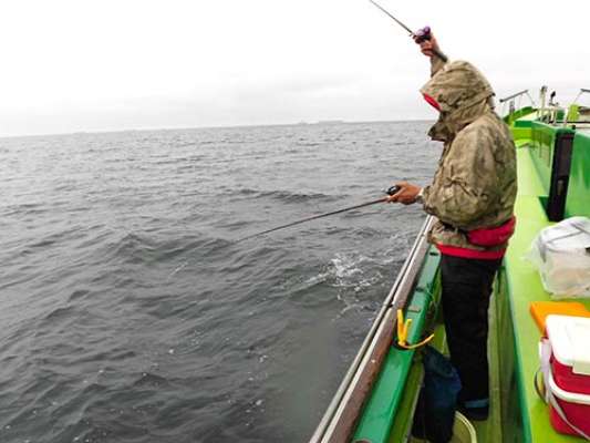 船長から「左舷で釣れたよ」、「また釣れたね」の“釣れたコール”のアナウンスがしきりに聞こえた。土砂降りの雨の中、ハイペースでイイダコが釣れたが、同時にバラシも多かった。船長は、「イイダコの活性は高く、スッテを抱いて素速く動いているようです。合わせてもバレるのは道糸にスッテに当たってイイダコが外れているんです」とアナウンス。勉強になる。先程「まだ“ツ抜け”ていません」と言っていた大西さんは、「潮が速くなったのでスッテの中通しオモリを8号に換えたら13連続ゲットしました」と嬉しそう。左舷胴の間(中央)の穐山さんや右舷大ドモ(船尾)の築山さんは、嬉しいゲストの今年産まれたスミイカの“新子”をゲット。「旨いよ!」と新子スミイカの味に船長も太鼓判。約2時間のラストスパートで1人当たり40~50杯のイイダコを追釣!!午前中の渋さが嘘のよう。結果、51~62杯!出船初日としては素晴らしい釣果で沖上がりとなった(竿頭は築山さん)。最近の出船でも竿頭は40~50杯。今年はイイダコの“当たり年”のようだ。是非挑戦して頂きたい。