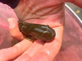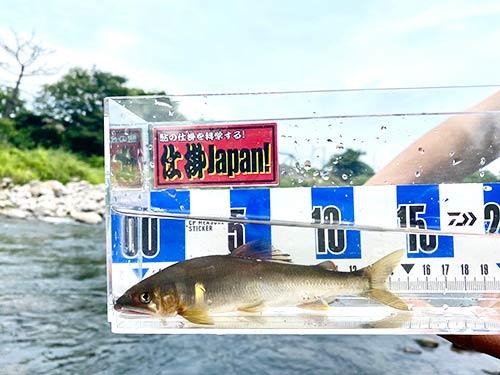 潮風香る最下流ポイント。海は目と鼻の先。“大マス”との戦いを終えた相方が下ってきた。話を聞けばあの後も何度かマスに襲われたとのことだ。よくぞ粘った!(笑)いよいよ本日の最終ポイント。先程私がよく釣れた“段々瀬”の話をすると、やはり釣りにくい場所や、流れが荒いあまり竿の入っていないポイントがよいのではないかということに。相方は荒い“段々瀬”を狙うことにした。私はさらに下流の“チャラ瀬”を狙ってはみたが、一発で「こない所は釣れないだろう」と思い、今日は納竿とした。竿を畳んで相方の元へ。かなり際どい荒い段へとオトリを送り込もうとしていた。オトリを空中輸送しポイントへ送り込む。するとスッコーン!と目印が大きく吹っ飛んだ。「いたー、飛びつき~!」。下の淵に吸い込まれないように堪える。大きくしなる竿を見ているだけでもドキドキする。オトリアユが水面に顔を見せたところを一気に引き抜き、「シュッ」と音がしそうなくらい豪快にタモへと吸い込まれていった。今日の締めくくりには最高のアユとなった。早川は足を使って”なんぼ”の川。釣り返しはなかなか効かない。しかし足を使い、“竿抜け”ポイントを見つければ、目印を吹っ飛ばす天然アユが楽しませてくれる。これからますます楽しみな早川。どんどんアユも成長し、さらに私たちの竿を大きく曲げてくれることだろう。