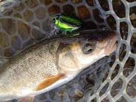 釣行当日は9時から18時くらいまで川辺にいたが、時間帯による魚の移動をハッキリと感じることが出来た。振り返ってみると、日差しの強い時間帯は日陰での反応が圧倒的に良く、ベイトフィッシュも日の当たらない場所に多く見られた。バス釣りのコツとしてよく目にする「日中は日陰を狙え」は、概ねトラウトにも当てはまる。ただ一方で、日差しの和らぐ16時から日没寸前になると魚が分散し、特に岸に寄る印象を受けた。実際に、中々お目にかかることが出来ない40cmオーバーのニジマスが、岸寄りの浅いポイントでヒットしたり、小さなヤマメが食ってくることもあった。周りを見渡すと、場所に関係なく(感覚的には岸寄りが多い)ライズしている。ちなみに、日中のライズに関してもやはり日陰が多く、夕マヅメに近づくにつれて分散し始める印象だ。虫ルアーを使用した釣りは、季節や川によってもパターンや傾向が変わってくると思われる。今回感じたことを活かしつつ、様々なフィールドでトップウォーターの釣りを楽しんでいきたいと思う。