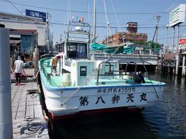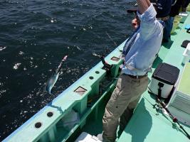 その後、テンビンでは“指3本”から“3本半”のタチウオが順調に上がった。釣り方のパターンを見つけた人は立て続けに釣り上げていた。「釣れた水深を覚えておいて、同じ水深を何度も狙ってみてください」と船長。そうすることで効率よくヒットさせられることがあると言う。終盤には更にサイズアップして“指4本”位のサイズがかなり交じるようになった。「型も狙える夏タチだ」。結果、65~121cmのタチウオが船中2~24匹。竿頭はあきる野市の小澤さん。121cmは大田区の長井さんがゲット。私も浅野コーチのおかげで14匹と十分なお土産。本田和芳船長に今後について聞くと、「タチウオは今年も夏のハイシーズンに突入しました。結構メーター級も上がっていますし、トップ50匹以上の日やビギナーの方が20匹以上釣られた日もあります。数も型も今後益々楽しみです」と自信を見せた。夏のタチウオ釣り、水分補給を十分しながら是非チャレンジしていただきたい。
