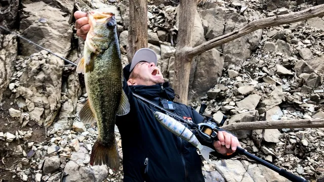 今回の舞台は徳島県の秘境・なか四季美湖。岩盤エリアが多く、ジャイアントベイトにはうってつけのフィールド。真冬のリザーバーでスーパーストライクを狙う。12月上旬にしては11度と高い水温と、バスのレンジが2m程度と深く、動きも鈍い状況。そんな中、完成間近のNEWルアーをキャストすると、早速ロッドに生命反応が…!