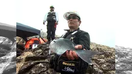 当日は半夜の2日目。沖の島周辺は強風のためどこの磯もお客さんは少ない。そんな中、東のハナのタカバに渡礁。撒き餌が利き始めすぐに、巨大尾長が乱舞。果たして…『こんなに活性の高いときは今までに見たことがない』との鬼才。しかし、サシ餌を食わないといういつもの状況が続き、最終的には午後6時に弟子の北村が食わせた。